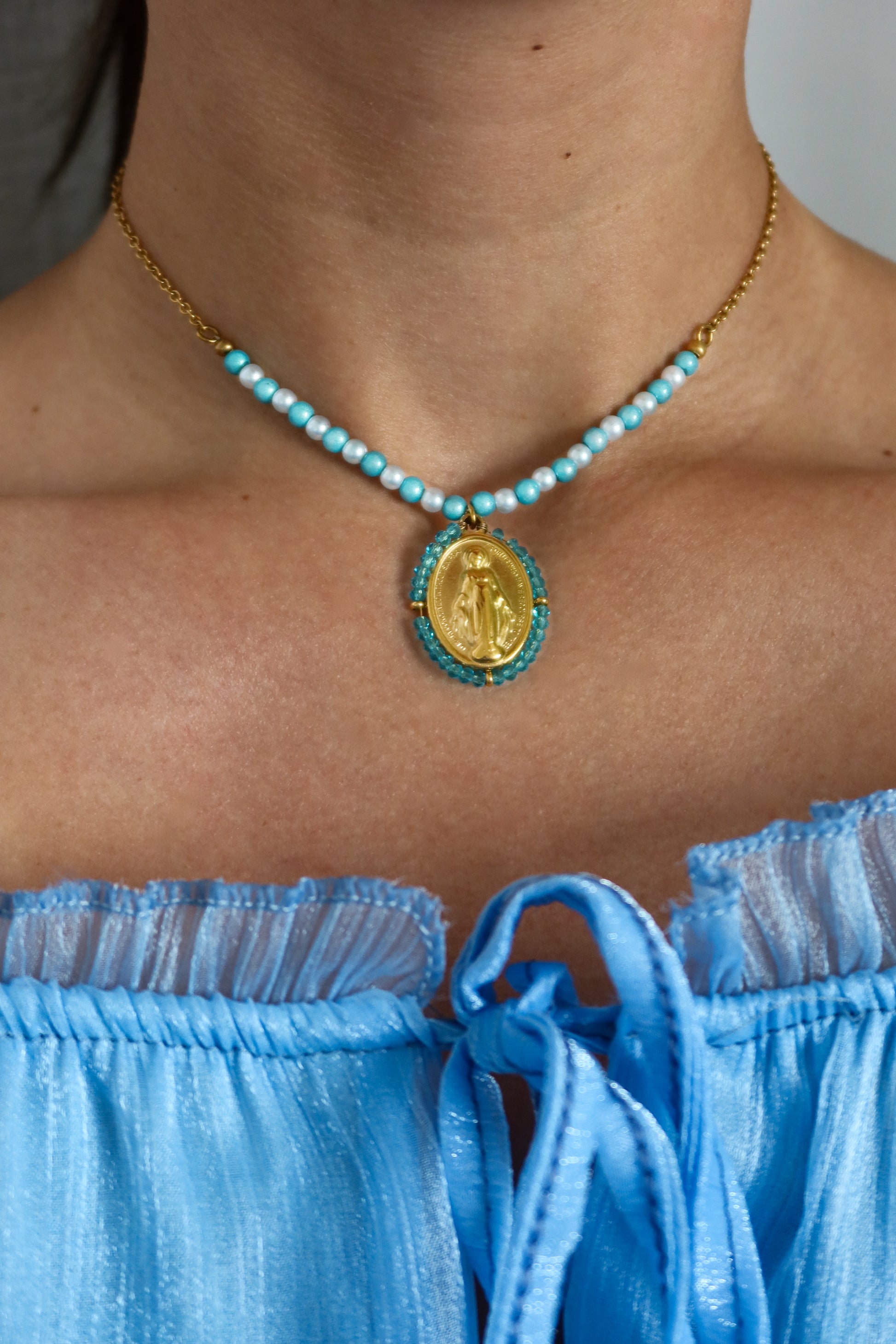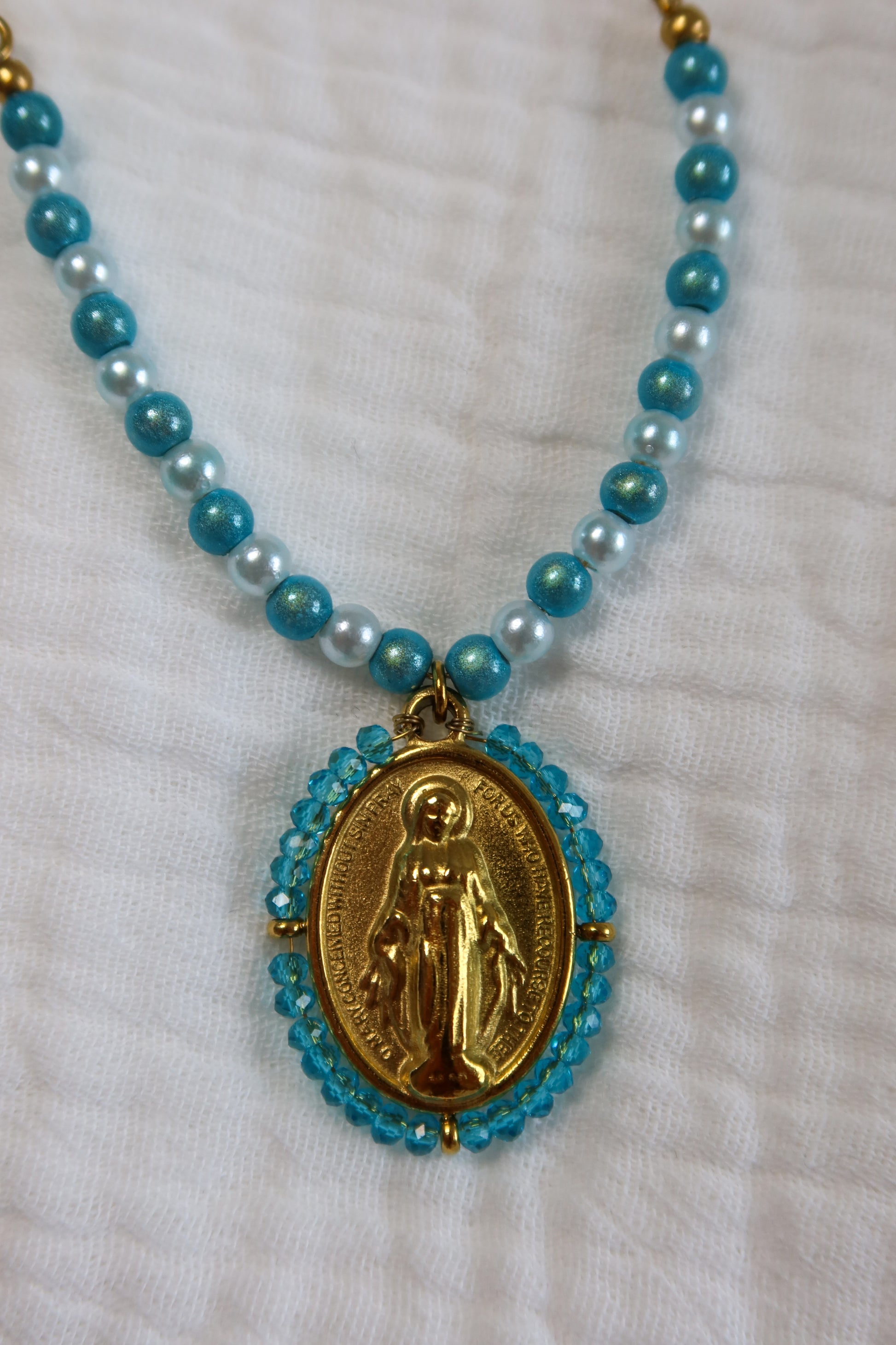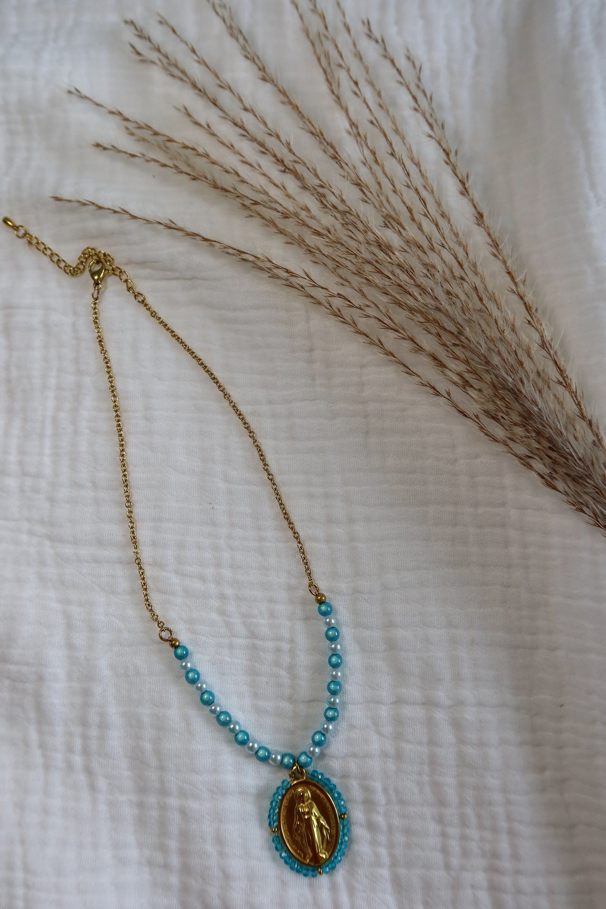 Ce collier mêle des perles bleu ciel et nacrées à une médaille dorée de la Vierge, bordée de pierres turquoise. Un symbole fort, revisité avec lumière et douceur, pour porter ta spiritualité au quotidien.